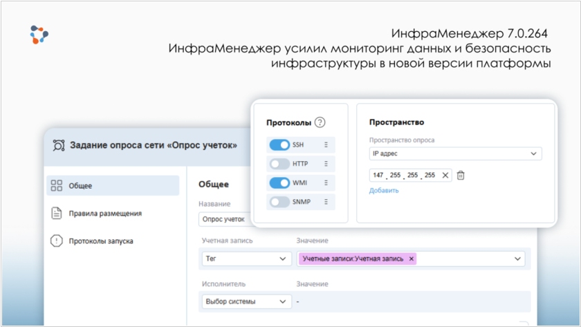 Команда ИнфраМенеджер улучшила работу модуля опроса сети в новой версии платформы. Разработчик оптимизировал сбор данных по протоколу WMI, добавил возможность сбора данных о виртуальных адаптерах для детального анализа инцидентов и управления конфигурациями в виртуальных средах; внедрил шифрование паролей и данных опроса приложений и баз данных для защиты конфиденциальной и технической информации организации; усовершенствовал агентский опрос, упрощающий и делающий более безопасным сбор данных с критичных серверов без необходимости ручной настройки протоколов и учетных записей; а также интегрировал API для автоматического распознавания программного обеспечения по данным опроса, что повышает точность ведения базы инсталляций для управления лицензиями и проведения аудитов.