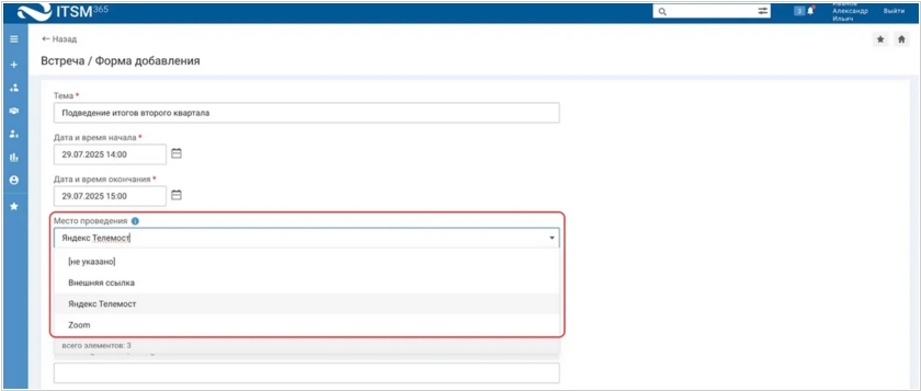 Встречи по видео — часть повседневной работы. Сотрудники созваниваются, чтобы обсудить задачи, уточнить требования, согласовать решения. Сейчас при создании встречи в ITSM 365 можно выбрать сервис видеосвязи Яндекс Телемост и система автоматически сформирует событие. Сгенерированная ссылка на созвон будет добавлена в приглашение на встречу для всех участников.