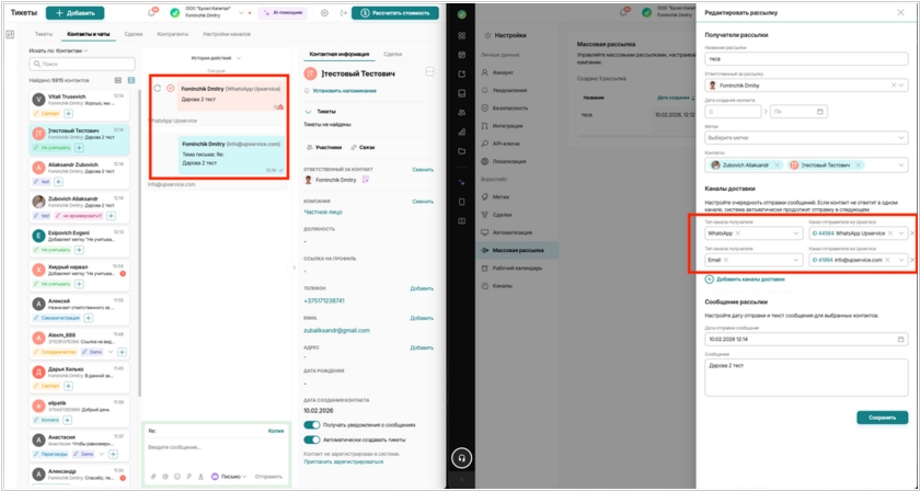 Upservice обновил модуль массовых рассылок: в системе появились цепочки каналов и автоматическое переключение, если один из каналов временно недоступен.Теперь при создании рассылки можно настроить порядок отправки по нескольким каналам и связать пары “тип канала получателя → канал отправителя в Upservice”. Рассылка возможна через MAX, WhatsApp, Telegram, Email и другие подключенные каналы. Пользователь задает дату отправки, после чего рассылка запускается автоматически. Сообщения уходят контактам строго по заданной цепочке: Upservice начинает с первого канала и завершает отправку, как только сообщение успешно отправлено. Если отправить не получилось из-за временной проблемы (канал недоступен или долго отвечает), система сама пробует следующий канал в списке — без ручных действий со стороны пользователя.