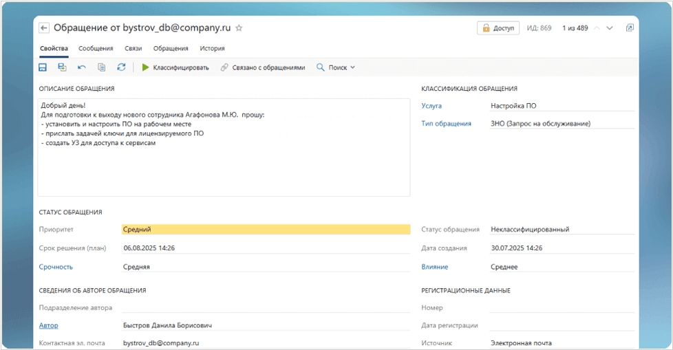 В новой версии Directum ESM появилась возможность принимать обращения пользователей через ИИ-помощника. Это реализовано за счет интеграции с корпоративным мессенджером / супераппом Directum Omni. В чате можно отправлять обращения в произвольной форме — умный бот распознает проблему и составит структурированную заявку. Если пользователь уже четко сформулировал запрос, он просто выбирает опцию из готового каталога услуг, который тоже доступен в приложении. Также, появился умный (вопросно-ответный) поиск, с помощью которого можно искать решение своих вопросов самостоятельно. Это снижает нагрузку на сервисные отделы, так как многие заявки уходят на самообслуживание, еще часть - трансформируется в понятные запросы. Благодаря связке Directum ESM с супераппом у пользователей есть возможность отправлять обращения в любое время и с разных устройств.