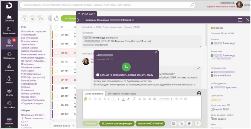 Разработчики Intradesk значительно доработали и упростили платформу управления заявками и CRM-систему. Теперь вы можете не только совершать звонки клиентам прямо из карточки заявки, но и получать полную расшифровку диалога благодаря встроенной телефонии и интеграции с ИИ от Яндекса. Что это дает вашему бизнесу? 1.Мгновенный контакт: один клик — и вы уже на связи с заявителем. Скорость реакции вырастает в разы. 2.Прозрачность: весь разговор записывается, а ИИ превращает его в текстовый диалог, который автоматически сохраняется в заявке. 3.Аналитика эмоций: после завершения звонка ИИ оценивает удовлетворенность клиента, помогая выявлять проблемные зоны.4.Увеличение эффективности работы сотрудников: автоматическое создание истории звонков и их транскрибация избавляют команду от рутины.