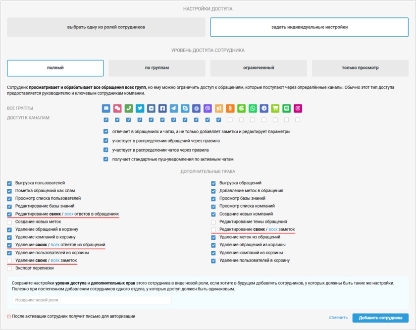 Разработчики Omnidesk добавили возможность редактировать и удалять ответы и заметки в чатах. Омнидеск автоматически синхронизирует правки с внешними каналами, если они это поддерживают. Если канал не поддерживает изменения сообщений после отправки или вы пытаетесь изменить или удалить ответ клиента, то изменения будут применены только на стороне Омнидеска. В записи в истории действий также будет отражена эта информация. Также, в обновлении добавлены гибкие настройки прав доступа к опциям, новые условия в правила и поддержка вебхуков для кастомных каналов, связанные с этим функционалом.