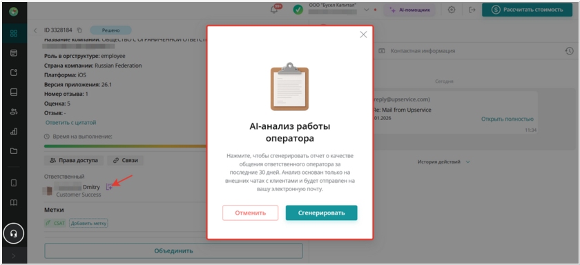 В сервисе Upservice появился новый функционал — AI-анализ качества общения операторов с клиентами. Инструмент позволяет руководителям формировать аналитические отчеты по переписке сотрудников за последние 30 дней. Функция доступна из карточки сотрудника: рядом с полем «Ответственный» добавлена кнопка запуска анализа. После подтверждения система формирует отчет автоматически. Готовый результат отправляется на электронную почту и дублируется уведомлением внутри сервиса. Запуск анализа возможен только для руководителей и только по своим подчиненным. Отчет включает оценку тона общения, релевантности ответов и качества формулировок. Отдельный раздел посвящен рекомендациям по улучшению коммуникации с примерами из переписки. Также в документе выделяются удачные и проблемные моменты с указанием конкретных сообщений, дат и времени.