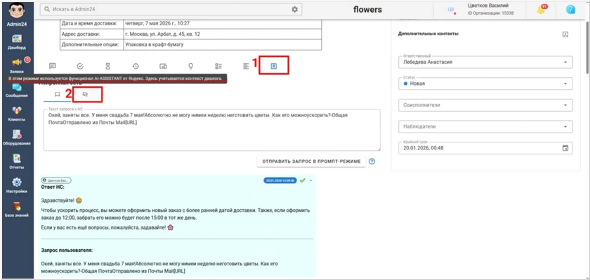 В очередном обновлении Admin24 был улучшен ИИ-агент – инструмент, который анализирует обращения клиентов и предлагает готовые варианты ответов. ИИ-агент помогает ускорить обработку заявок, снизить нагрузку на сотрудников и сохранить единый стиль коммуникации с клиентами. Агент работает как непосредственно из карточки заявки, предлагая ответ на последний комментарий клиента, так и в расширенном режиме с учётом всего контекста переписки. Гибкие настройки позволяют адаптировать ИИ под процессы компании: выбрать нейросеть, настроить стиль и развёрнутость ответов через системные и пользовательские промты, управлять объёмом анализируемого текста, а также протестировать работу агента в специальном разделе.