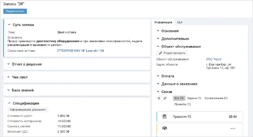 В сервисе для поддержки клиентов ITSM 365 обновили виджет «Связи» на карточке заявки. Теперь все связанные с заявкой задачи, согласования, проблемы, проекты и изменения выведены в виджет «Связи» на карточке заявки. По клику на объект из списка можно перейти в его карточку и узнать подробности. Там же можно создать новый связанный объект или связь с уже существующим объектом.