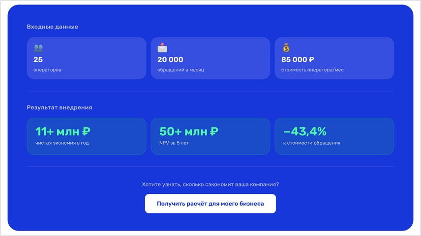 Российский разработчик ИИ-платформ AutoFAQ запустил сервис персонального расчёта экономики для руководителей клиентских сервисов. Компания считает эффект под данные конкретной службы поддержки и передаёт результат напрямую. Для расчёта достаточно указать количество операторов, объём обращений в месяц и среднюю зарплату сотрудников. На основе этих данных специалисты AutoFAQ формируют персональный отчёт: снижение стоимости одного обращения, чистую экономию за год после вычета лицензии и NPV за 5 лет. Например, служба поддержки с 25 операторами и 20 000 обращений в месяц получает чистую экономию от 11 млн ₽ в год. Стоимость одного обращения снижается на 43%, NPV за 5 лет превышает 50 млн ₽.