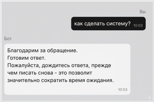 В среднем ИИ-агенты Wikibot отвечают за 30 секунд. Однако в отдельных случаях обработка на стороне большой языковой модели может занимать 1–2 минуты. Но для некоторых компаний критично, чтобы пользователь получал реакцию сразу: если ответа нет, он начинает волноваться и писать повторно. Поэтому разработчики добавили функцию «Быстрый ответ» — это короткое сообщение, которое отправляется пользователю до основного ответа бота и только на первое сообщение в диалоге. Быстрый ответ отправляется мгновенно и не расходует кредиты.