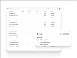 В HubEx появился новый инструмент для централизованной работы с материалами. Он упрощает работу начальников сервисных служб и других ответственных сотрудников, позволяя контролировать весь список материалов, обновлять информацию и выполнять некоторые массовые операции. Полный список материалов отображается в табличном виде: наименование, описание, артикул, единица измерения, стоимость и ERP ID. Доступна сортировка по алфавиту и поиск по названию или ERP ID. Удобное редактирование через боковую панель: обновление описаний, артикулов, стоимости и других параметров. Управление статусом материалов — удаление, восстановление, в том числе массовые, а также возможность фильтровать по статусу удаления.