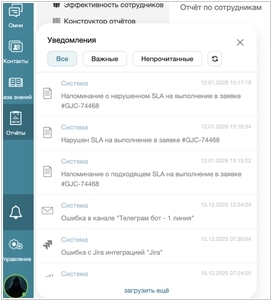 Полностью новый центр уведомлений реализовали в последнем обновлении разработчики HelpDeskEddy. В левом нижнем углу меню появилась система уведомлений в виде колокольчика, заменившая старые баннеры. Красная точка сигнализирует о рядовых событиях: назначении исполнителем, упоминаниях сотрудника в заявке, изменениях приоритета или дедлайна по SLA. Если колокольчик становится красным целиком, это критический сигнал: ошибки в каналах связи или готовность отчета. Прочитанные уведомления становятся полупрозрачными.